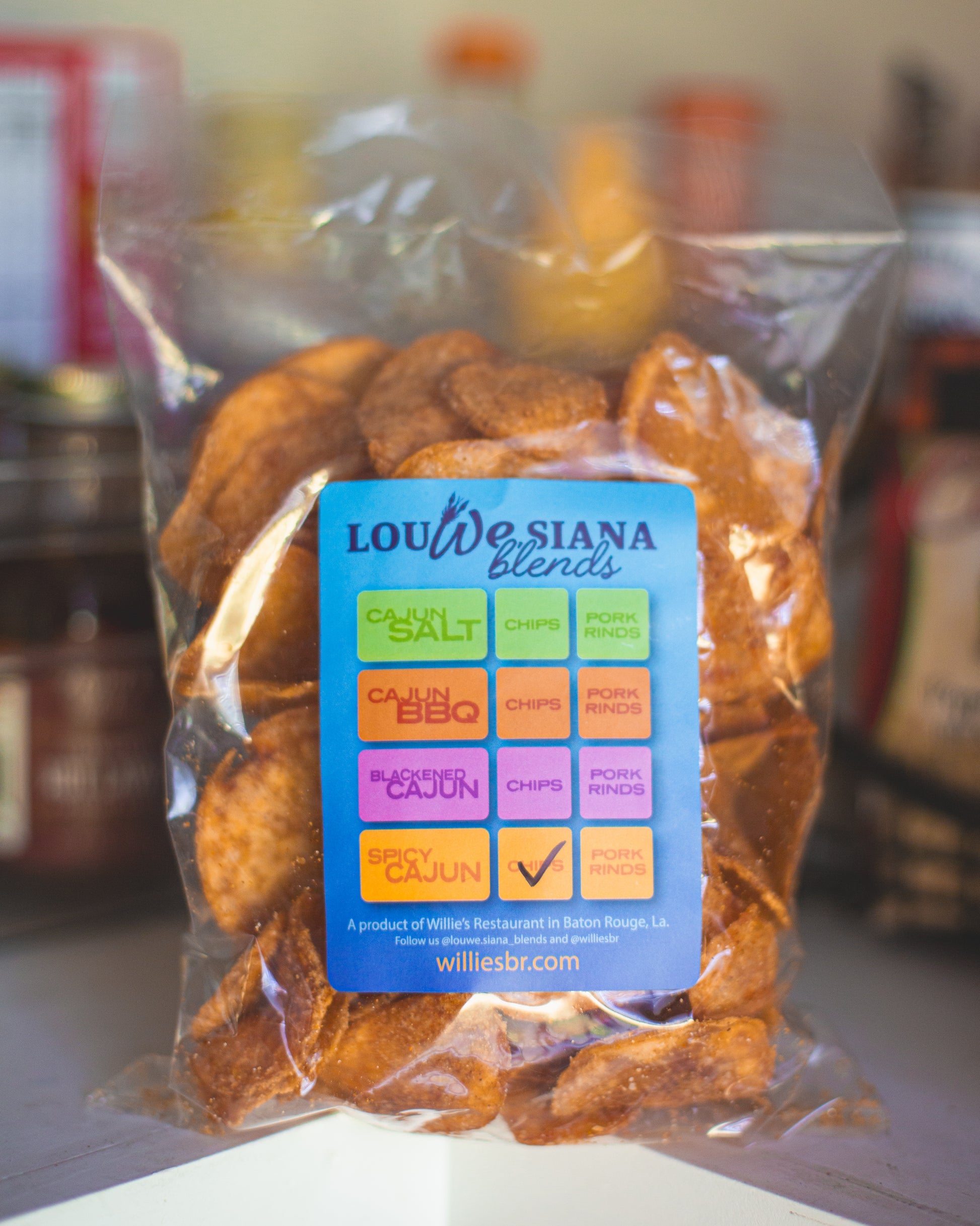 Our homemade chip seasoned with Spicy Cajun. A little kick of spice, sweet, and lots of flavor!