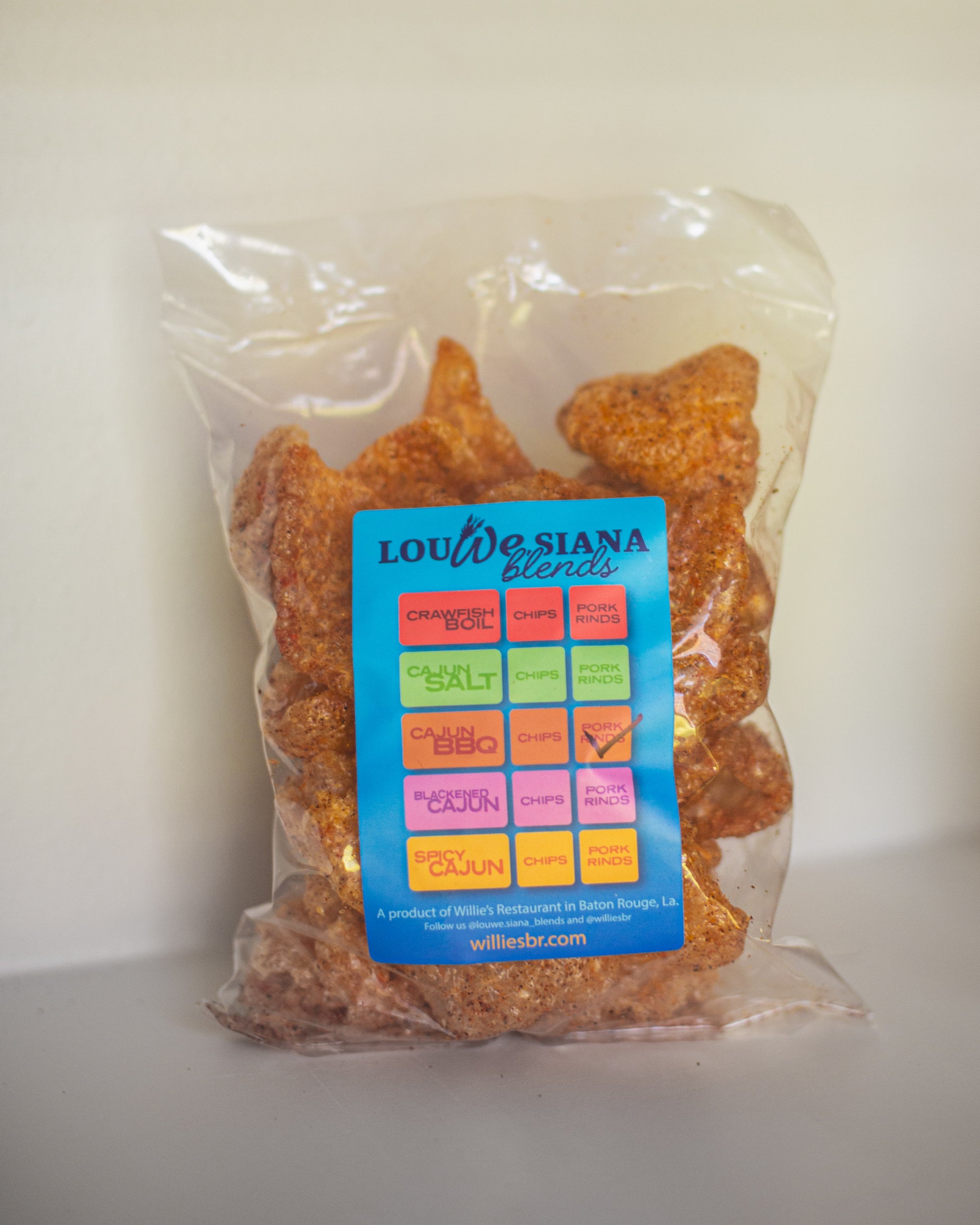 These pork rinds are seasoned with Cajun BBQ, a bold blend of spices, salt, and brown sugar.