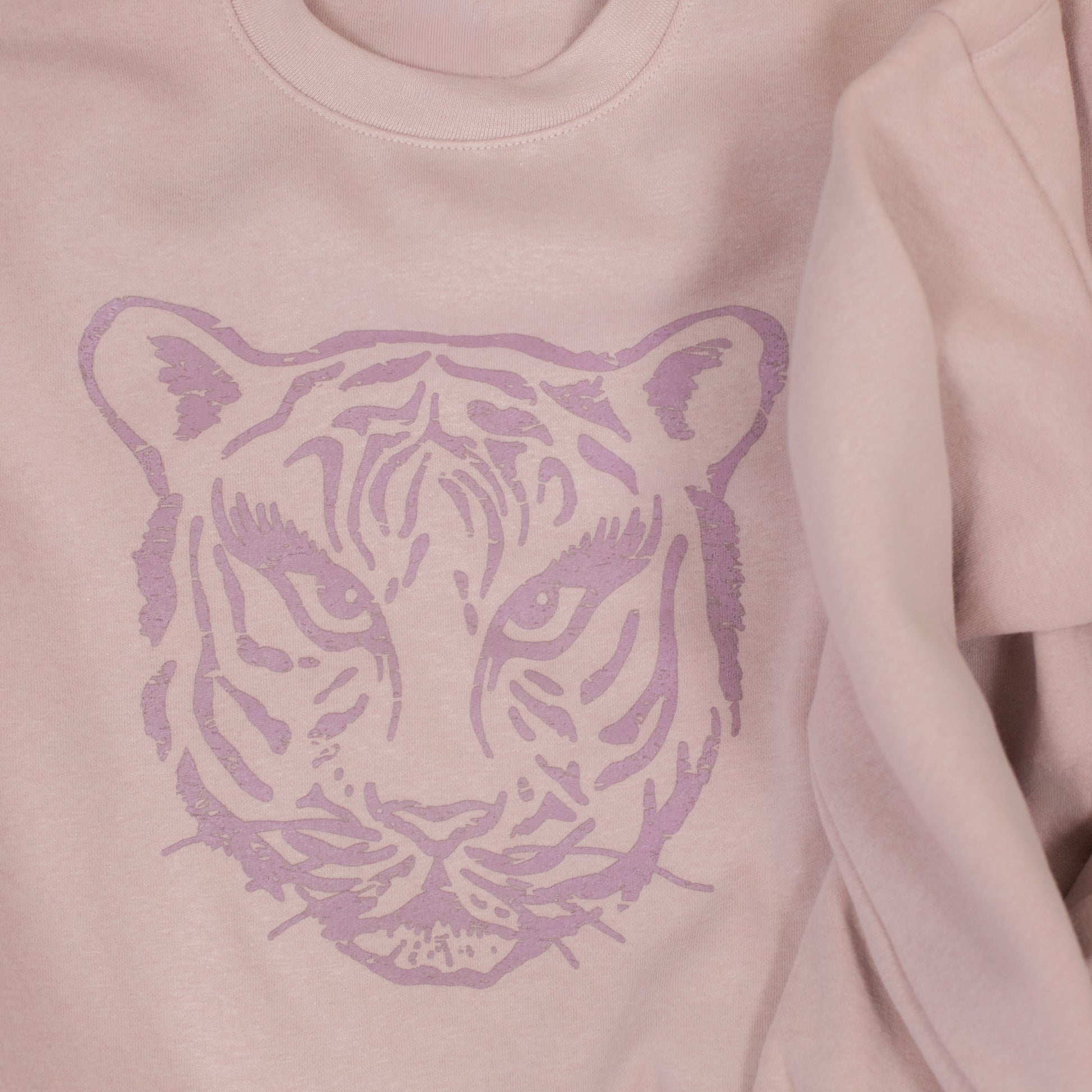 The Tigress design is printed in dusky lavender on a blush boxy fit, slightly cropped sweatshirt.